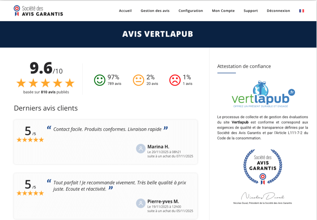 Une procédure de traitement des réclamations et un tableau de synthèse avec suivi des objectifs ainsi qu’un suivi des avis clients (via Avis Garantis – note de 9,6/10) permettent à notre société de s’assurer de la satisfaction des clients. Notre méthodologie de gestion de la satisfaction clients nous paraît à date en adéquation avec notre contexte.