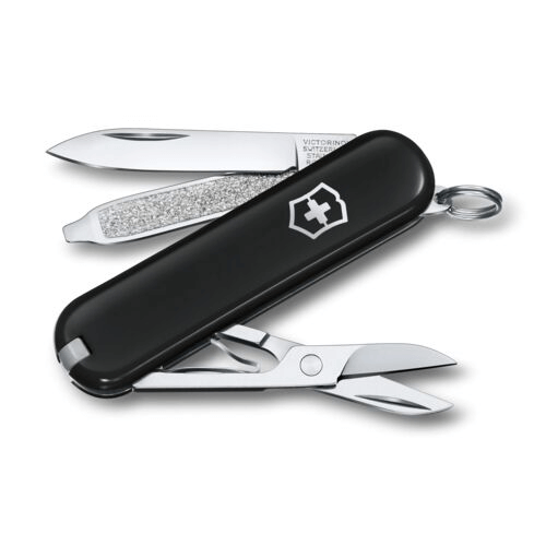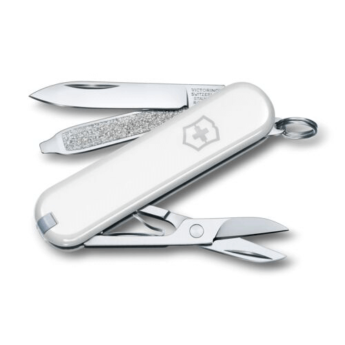 Ce petit couteau pliable publicitaire fabriqué et marqué en Suisse est doté de 7 fonctions : petite lame, ciseaux, lime à ongles, tournevis 2,5 mm, pincettes, cure-dents et anneau pour pouvoir l’accrocher en porte-clés.