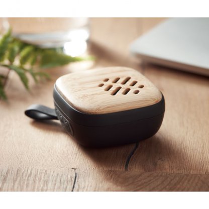 Cette enceinte Bluetooth 5.0 publicitaire est fabriquée en plastique ABS avec une façade en bambou et une poignée en silicone.