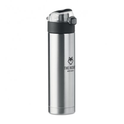 Cette gourde personnalisable à double paroi contient 400 ml. Elle est munie d’un verrou de sécurité sur le couvercle et d’un système d’ouverture par pression.