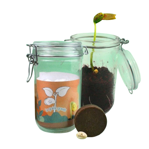 Kit de plantation avec graine gravée dans un bocal en verre. C’est un objet publicitaire surprenant qui révèle le logo de la marque au moment de la germination.