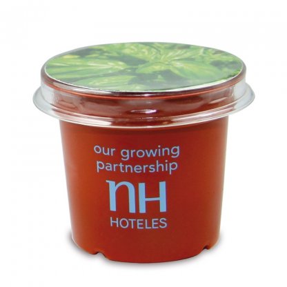 Au choix, vous pouvez personnaliser le pot par tampographie en une couleur ou en quadrichromie sur une banderole tout autour du pot. Dans les deux cas, la cartonnette du couvercle est imprimée en quadrichromie avec votre message publicitaire.