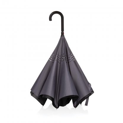 Ce parapluie réversible de 23 pouces vous protégera de la pluie, où que vous soyez. Mât en métal, baleines en fibre de verre et poignée en polypropylène. Sa fabrication à partir de 14,9 bouteilles en PET (500ml) a permis d’économiser 8,8 litres d’eau. Sa technologie d’ouverture inversée permet de rester au sec, au moment de l’ouverture.