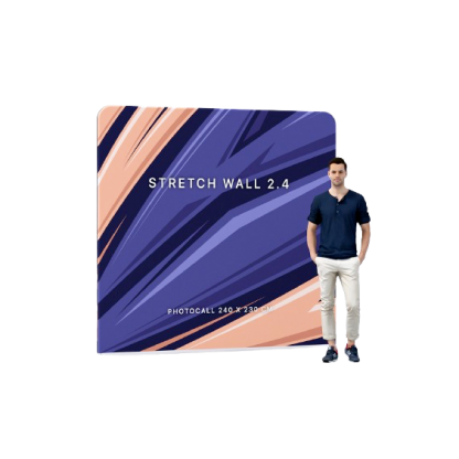 Le photocall STRETCHWALL 2.4 de 2,4m est fabriqué en toile polyester recyclé 210g et traité anti-feu B1.