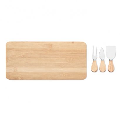 Ce set à fromage promotionnel en bambou comprend un plateau de service, 2 couteaux de service et une fourchette.