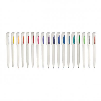 Le corps du stylo bille est de couleur blanche avec une touche de couleur opaque ou translucide sous le clip.