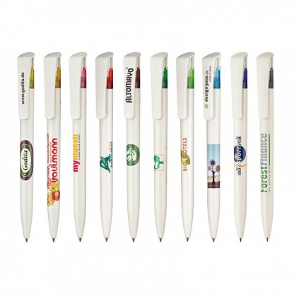 Le corps du stylo bille est de couleur blanche et sous le clip est apporté une touche de couleur.