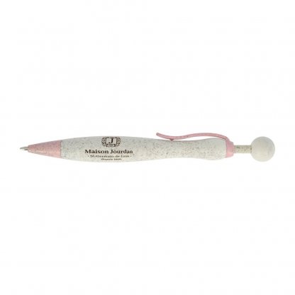 Ce stylo à bille publicitaire est fabriqué en bio composite avec 50% de fibres de blé et 50% de polypropylène ; il possède des armatures de couleur avec un corps beige. Son encre est de couleur noire.